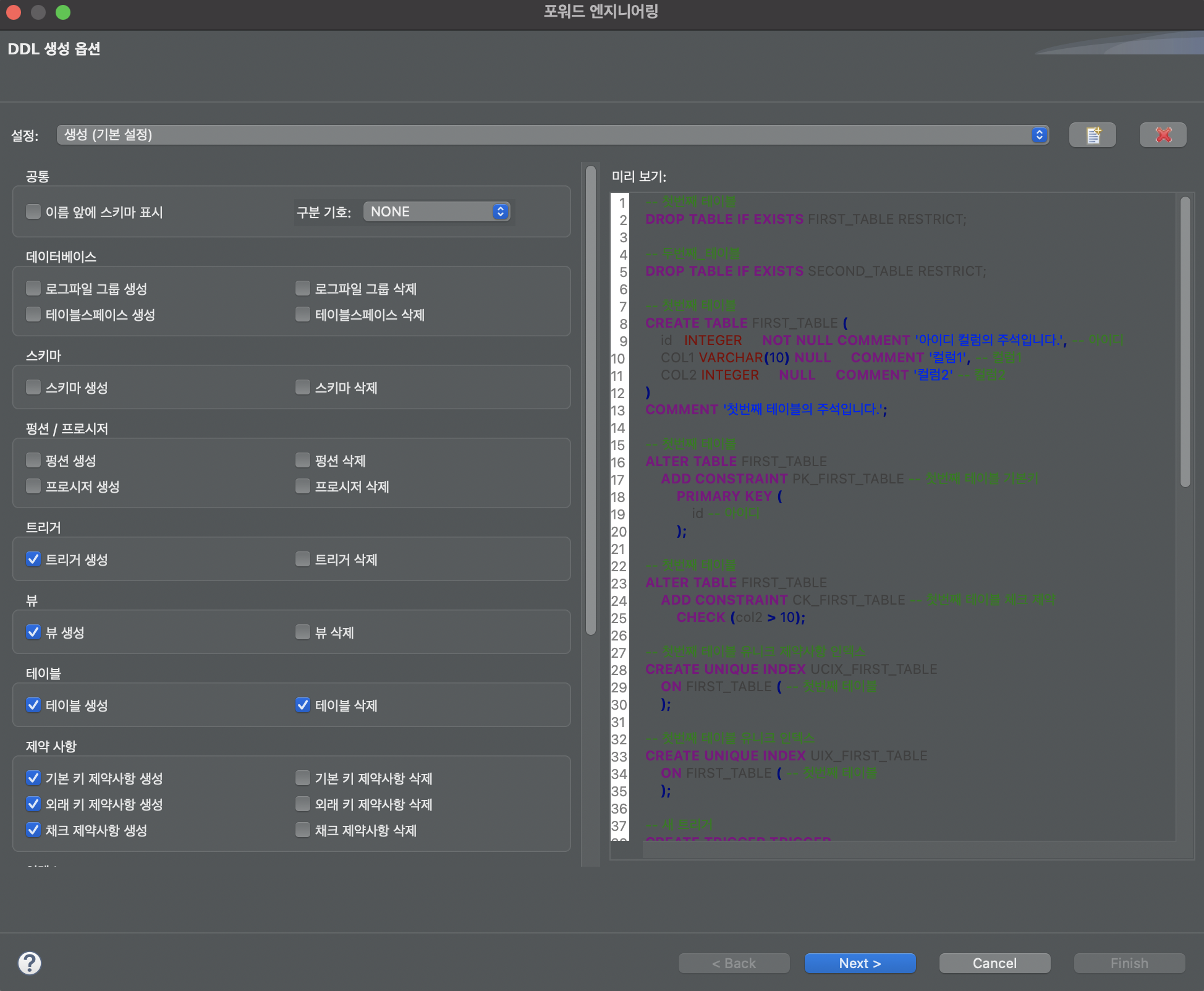 - 이름 옆에 스키마 표시 해제, 구분 기호 : NONE, 테이블 삭제 선택